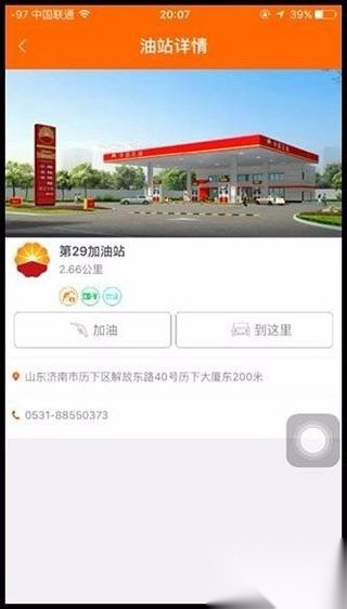 点击加油站详情,可查询加油站服务信息、联系电话等