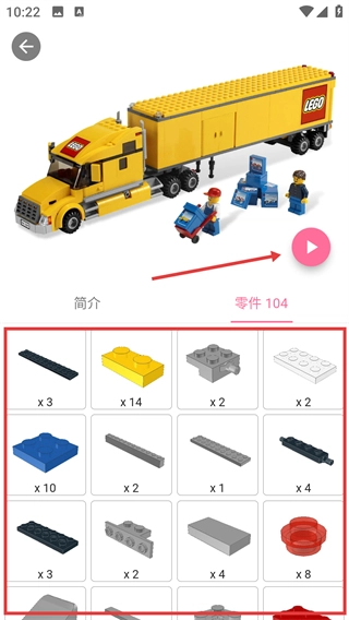 在零件清单界面点击播放按钮,即可进入该乐高作品的虚拟拼搭操作页面。