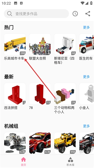 在首页的“热门”板块中找到并点击你想查看的目标作品(例如【乐高城市卡车】),这样就能进入到该乐高作品的详情页面了。