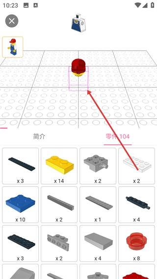 在虚拟拼搭界面中,你可以挑选零件(例如红色零件),并把它们放置到相应的位置,以此来完成拼搭的各个步骤。