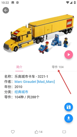 在作品详情页面点击【零件104】标签,即可切换到该作品的零件清单展示界面。