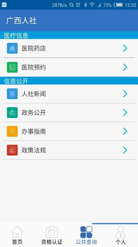 6. 轻点公共查询,即可查询医院药店、办事指南、政策法规等相关信息。