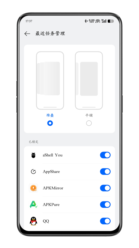 在最近任务管理界面就能看到全新改版的界面,还新增了堆叠后台的选项。