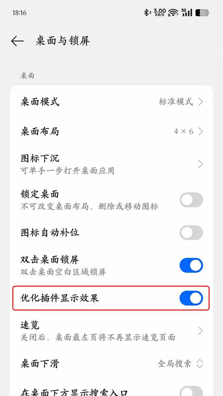ColorOS 15的桌面设置里新添了“优化插件显示效果”的自定义开关,该开关默认处于开启状态。