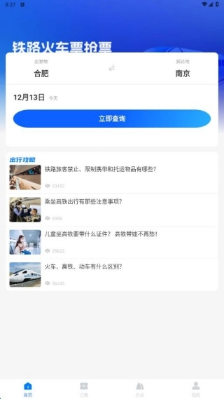 安装完成后进入首页,只需一键就能搜索车票,同时还能查看出行攻略。