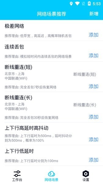在【网络场景推荐】里挑中你需要的场景,点一下【添加】,就能进到所选网络场景的详细数据设置页面,再依据实际情况调整对应的参数值就可以了。