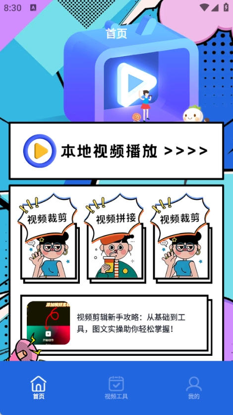 1. 首页具备本地视频播放功能,还支持视频裁剪、视频拼接等操作,并且提供相关教程。