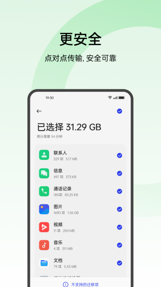 支持一键转移联系人、通话记录、照片、视频等常用信息,更换手机时无需担忧数据丢失问题。