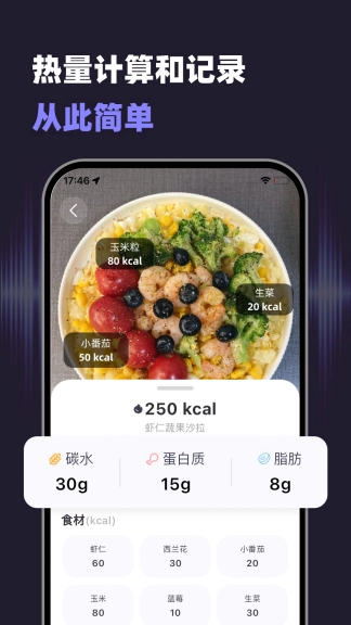 只需轻轻一拍,软件就能精准识别照片里食物的营养成分,不必再手动输入或查找食物相关信息。