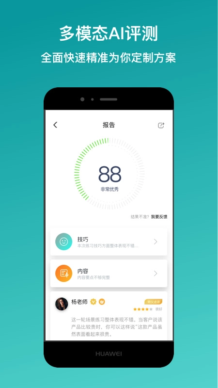 新华e练最新版本的系统借助智能技术,从内容与技能两个维度,对学员的声音、表情、情感以及表达展开了分析。