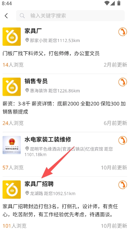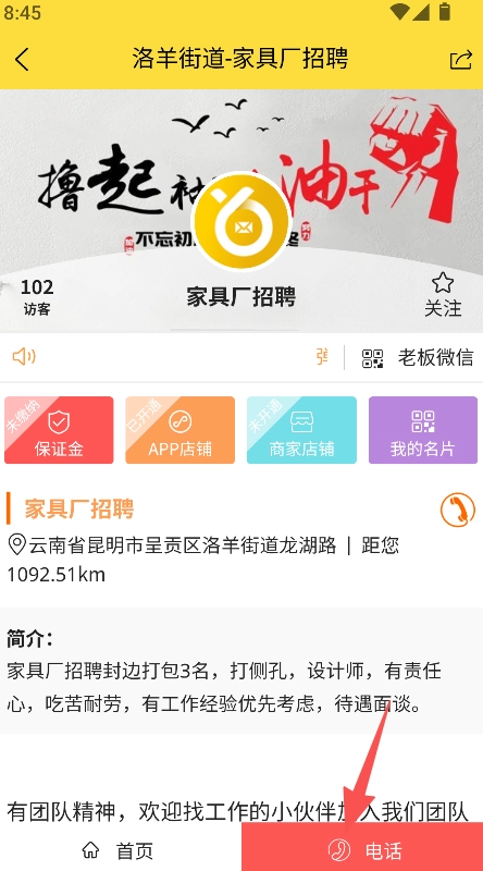 点击进入招聘详情页,浏览信息后点击电话按钮与对应主体取得联系。