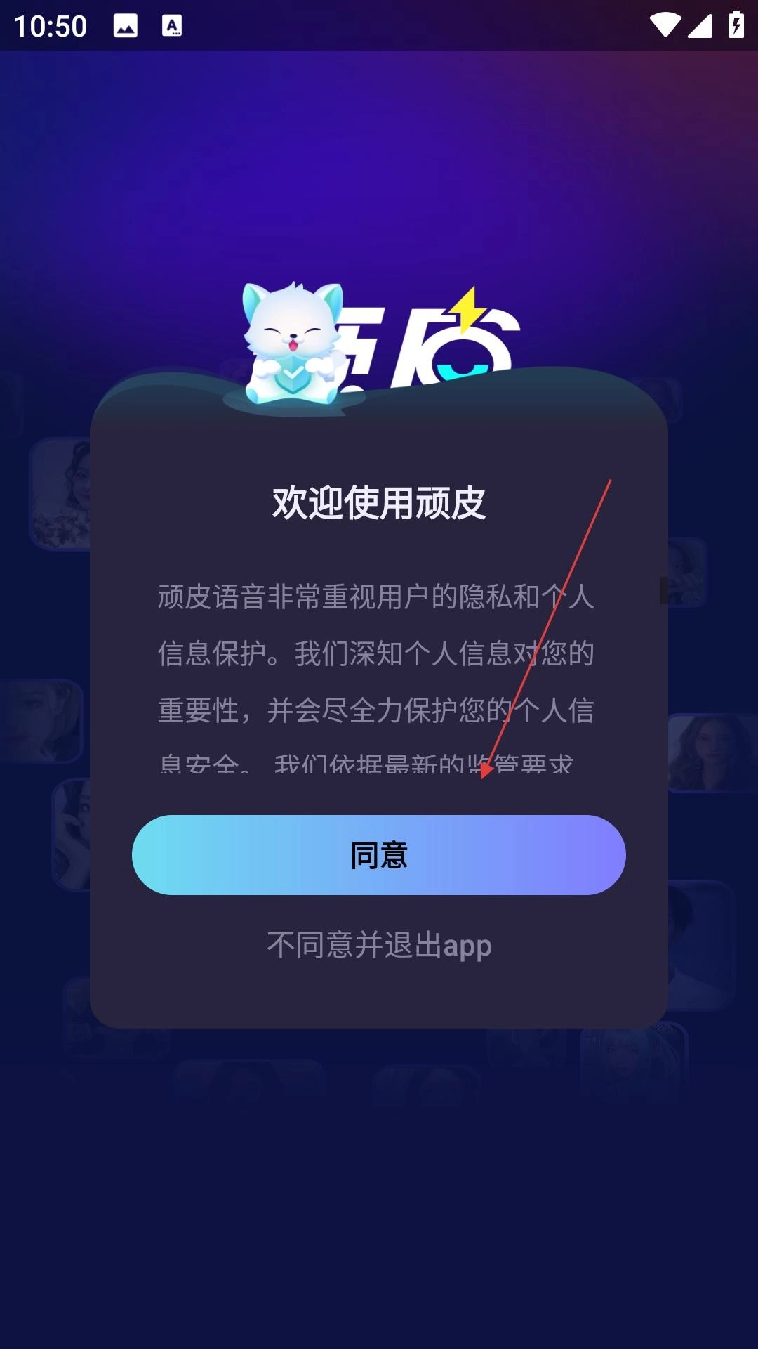 进入登录页面后,填写手机号码和密码,勾选相关协议,点击登录按钮,随后使用顽皮语音功能进行互动交流。