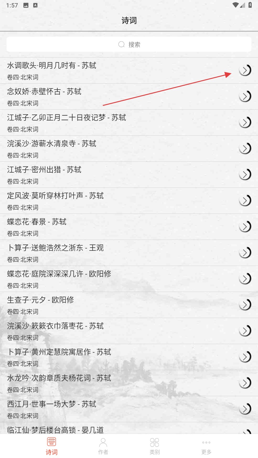 在“诗词”列表页面,点击每首诗词右侧对应的按钮,即可进入该诗词的详情页面查看具体内容。