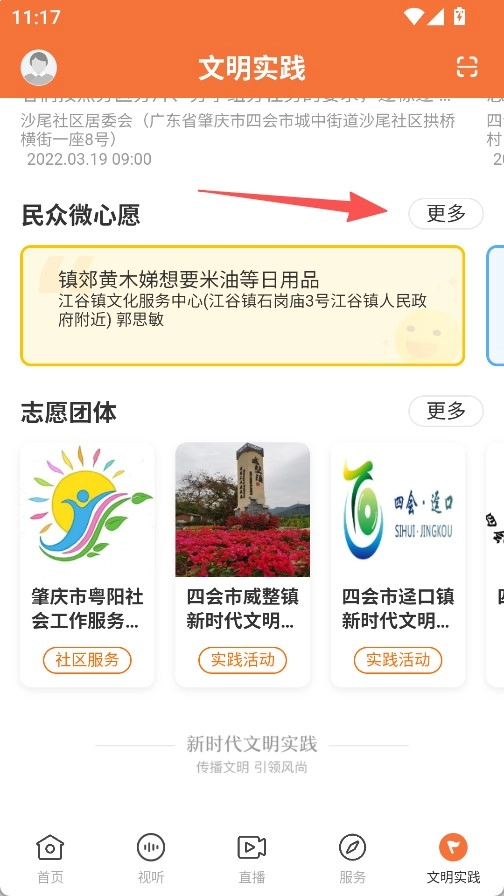点击底部文明实践”,再点击民众微心愿旁的更多。
