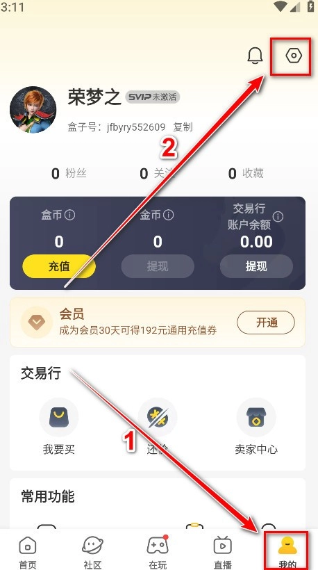 请在本网站的当前页面安装最新版的996传奇盒子,打开该软件进入首页后,先点击右下角的“我的”,再点击右上角的设置按钮。