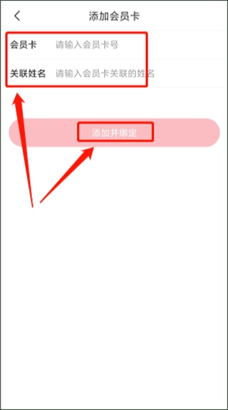 进入添加会员卡的界面后,输入会员卡信息与关联姓名,接着点击添加并绑定的按钮,这样就完成操作了。