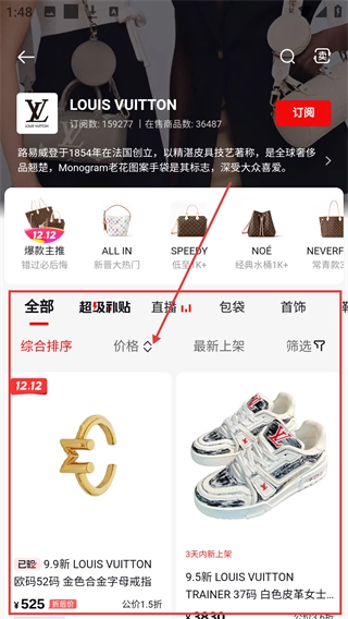 在红布林首页,点击品牌栏中的【LOUISVUITTON】图标,即可进入该品牌的商品列表页面。