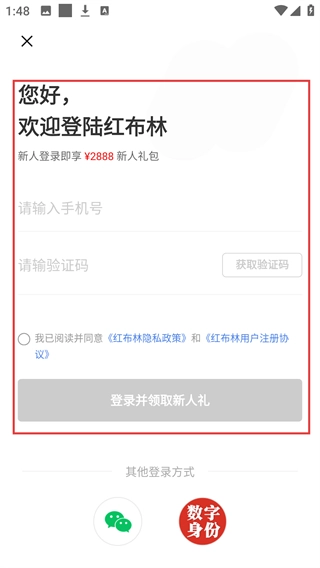 触发购买操作后会跳转至登录页面,填写手机号与验证码并勾选相关协议,即可完成登录并领取新人礼。