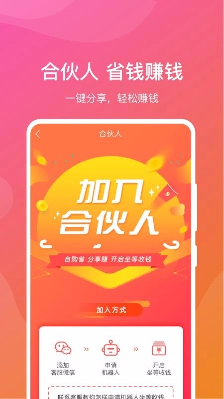 可以通过加入合伙人计划,与平台在线协作推广商品获取收益,购物时平台也会为你提供支持。