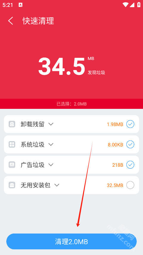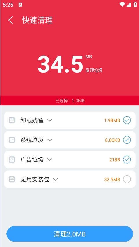 回到首页后点击“清理”按钮,稍等几秒让系统扫描本地文件,之后再次点击“清理”就能一键清除手机里的垃圾文件了。