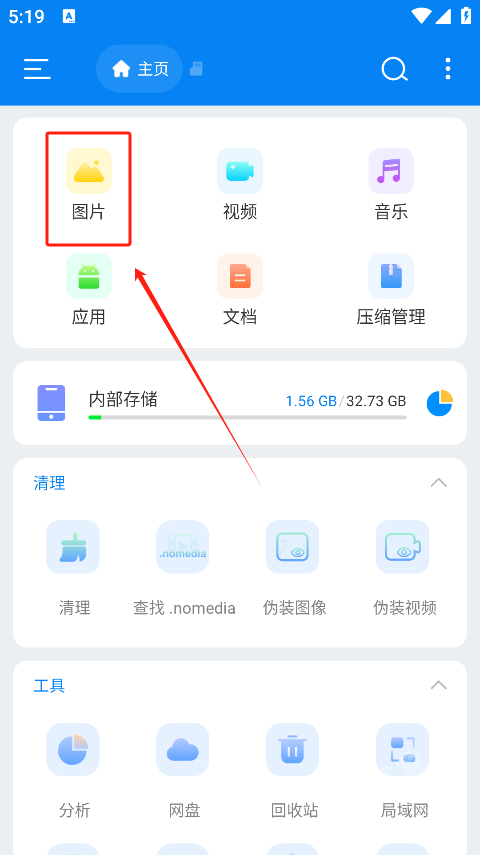 进入首页后,点击你需要整理的本地文件,这里以照片为例进行说明。打开照片后,就可以对照片执行转移、隐藏等操作。