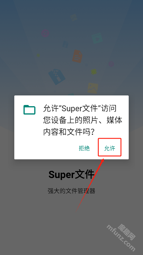 首先前往魔趣网下载并安装esuper文件浏览器,随后点击“允许”按钮进入该软件。