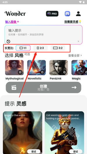 文心一格具备尺寸选择功能,用户可在此挑选成品图像的尺寸大小。