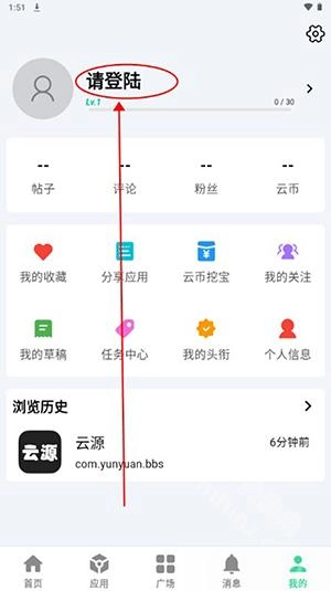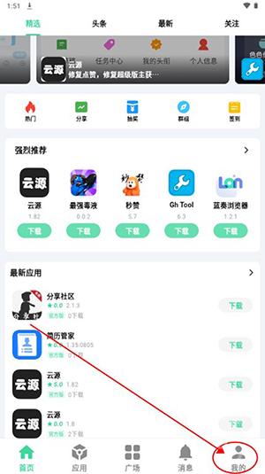 首先在魔趣网下载并安装云源软件,进入首页后点击右下角的“我的”选项。