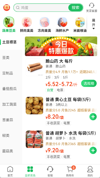 选购商品:您可以在首页看到各类食材的分类,按照需求挑选对应的分类进行浏览,进而选择您心仪的食材。