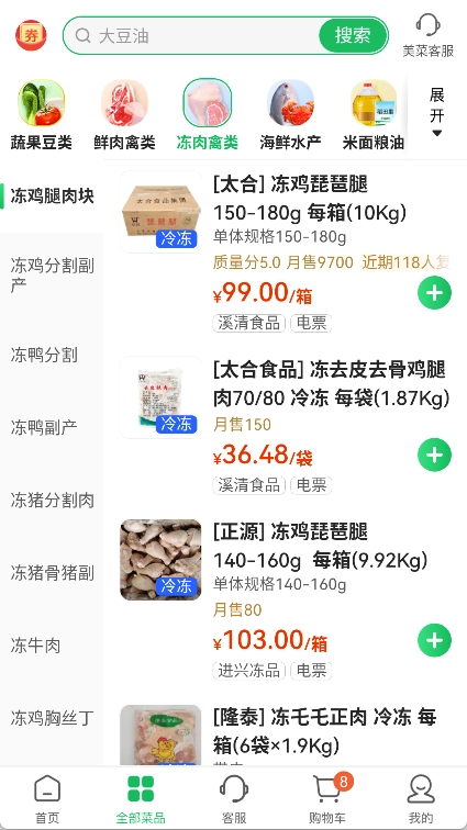 答:您可以在首页或全部菜品界面的顶部空白区域,输入想要找的商品名称来搜索。要是没找到您需要的商品,可前往“我的”页面,点击“提交新品需求”填写相关信息,我们会依据商户的需求情况来安排采购和销售。