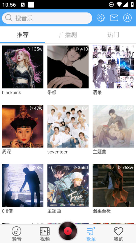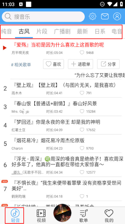 安装轻音社1.4.0.0旧版本后,在底部菜单栏选择【轻音】选项,接着就能从流行、英文、纯音、古风、片段、广播剧、最新、日系、电音这些分类里挑选你偏好的音乐类型了。
