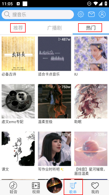 点击底部【歌单】栏目,会提供一些歌单供你选择。你可以按推荐或者热门来筛选。