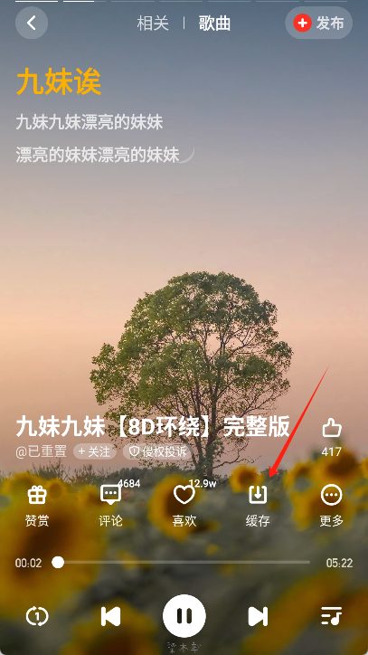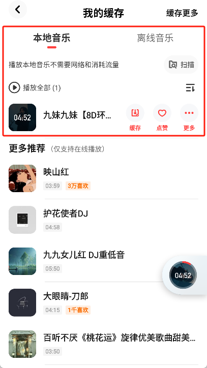 在歌曲详情页有个“缓存”按钮,点击该按钮即可开始缓存歌曲。