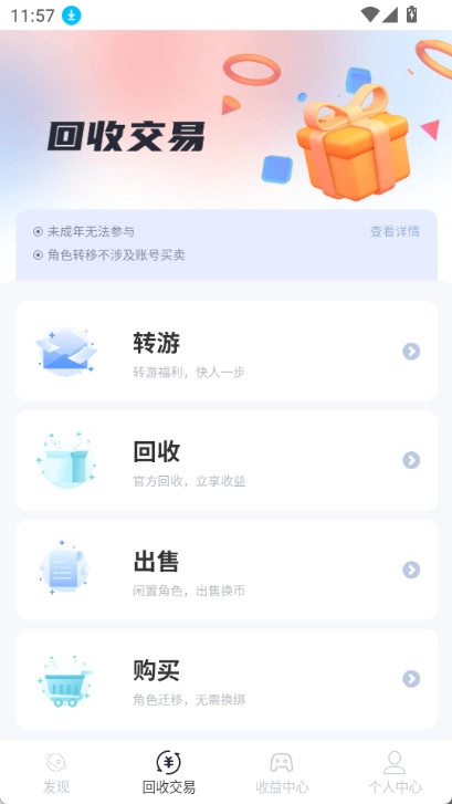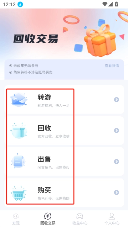 回收交易模块提供转游、回收、出售、购买等功能,大家可根据自身需求选择体验。