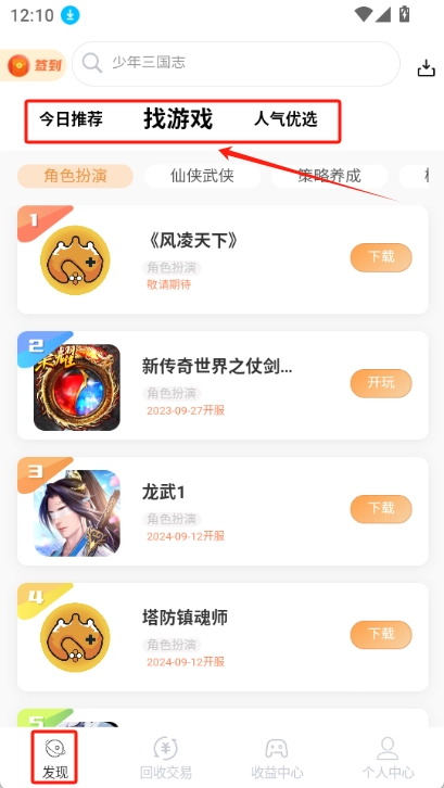 发现:有今日推荐、找游戏、人气优选几大块内容,你可以在里面观看游戏视频、查找游戏,还能进行游戏相关操作。