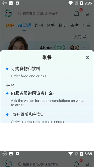 3. 智能口语练习功能:具备智能实时口语评分机制,支持逐句跟读,并针对每个单词进行打分。同时配备AI口语教练,可开展多场景口语练习。