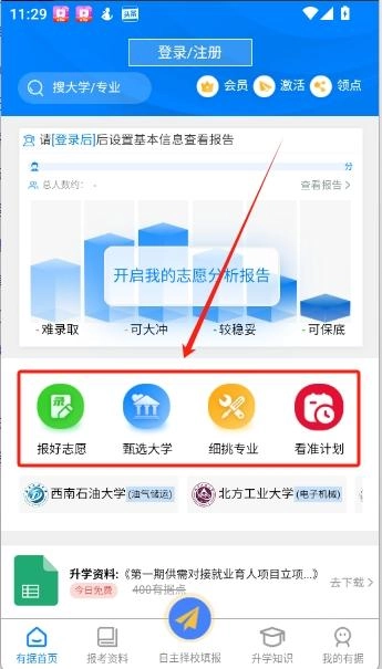 首页设有“填志愿”“甄选大学”“选专业”等多项功能,可供大家体验。