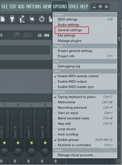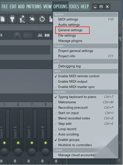 打开FL Studio编曲软件后,点击顶部菜单栏中的“OPTIONS”选项,接着选择“General setting”,就能打开常规设置窗口了。
