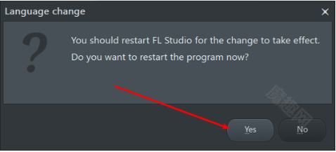完成语言设置后,会弹出“语言切换”窗口,窗口内显示提示:“需要重新启动FL Studio编曲软件才能使设置生效,是否确定现在重启?”点击“yes”按钮即可完成设置并重启FL Studio编曲软件。