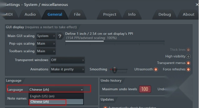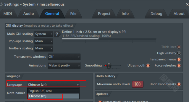 打开FL Studio的“常规设置”窗口后,在“language”模块里能找到language的选项框,点击这个下拉选项框,从中选择“Chinese(zh)”就可以了。