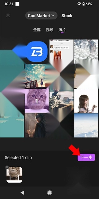 打开相册,挑选需要进行编辑的视频或照片文件,然后点击“下一步”按钮。