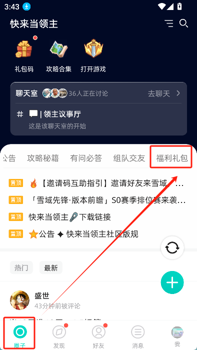 登录梦游社后,点击首页下方的“圈子”板块。在这个板块里,你能浏览到各类游戏福利,像游戏礼包、兑换码之类的都有。