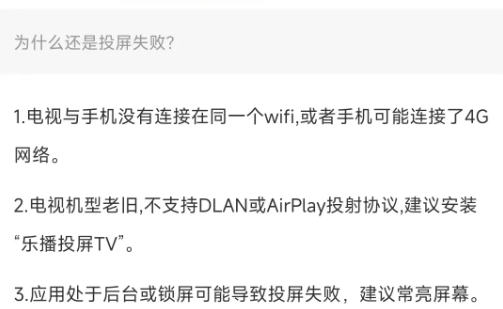 应用在后台运行或者处于锁屏状态时,可能会造成投屏失败的情况,因此建议保持屏幕常亮。