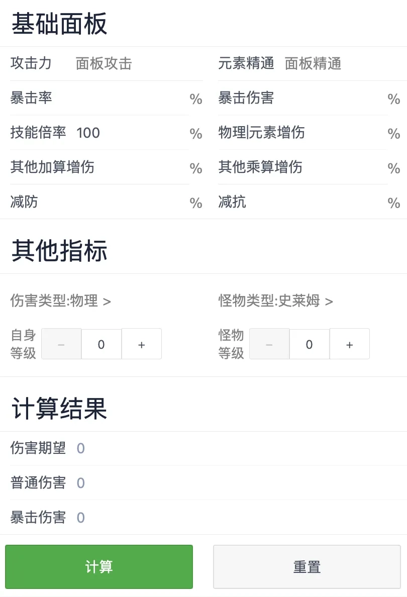 伤害计算查询:用于计算不同技能对各类怪物造成的伤害数值,帮助玩家了解如何优化角色面板属性以及制定角色培养方向。