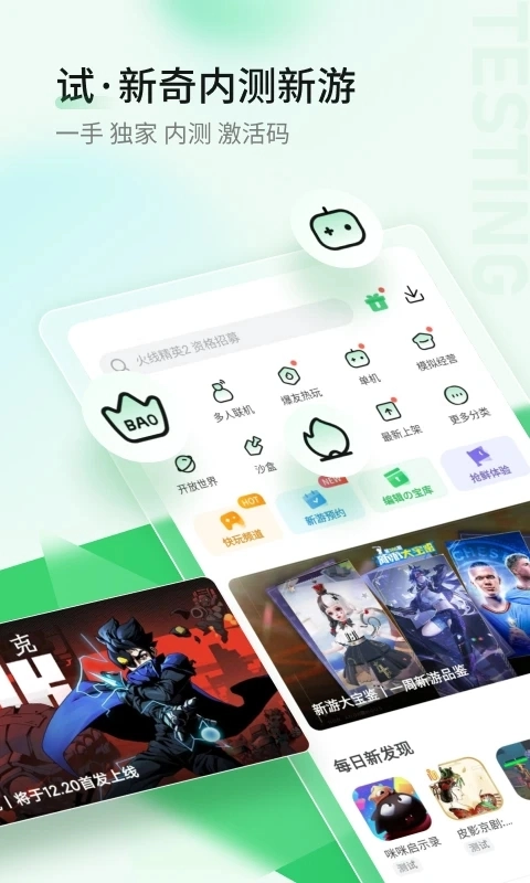 好游快爆是一款十分实用的游戏工具,在这款应用里,你能发现海量有趣的游戏,涵盖大厂制作、独立开发者作品,还有不少资源稀缺的魔改游戏等。除了具备极为丰富的游戏获取渠道,好游快爆还会为众多玩家带来最新的新游推荐,大部分新游的测试资格和体验机会,你都能在这里抢先获得并游玩。