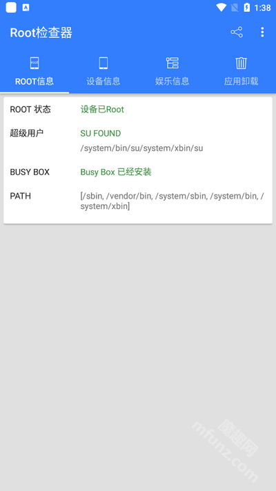 可以查询root状态、超级用户、busybox是否已安装以及path路径