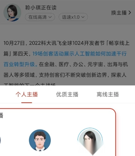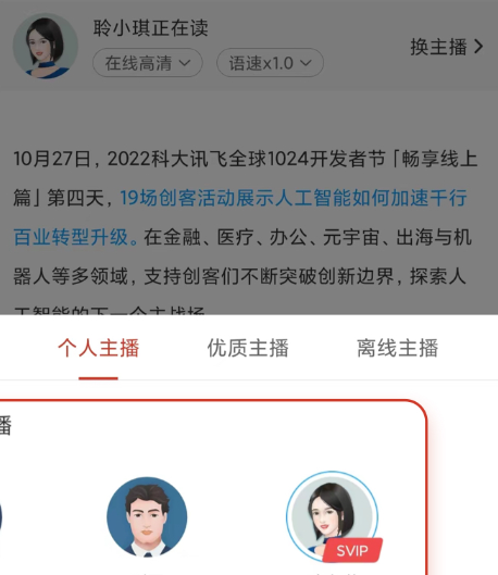 A.I.主播:支持多样化声音选择,涵盖不同音色、方言与语种,可满足您个性化的听书需求。