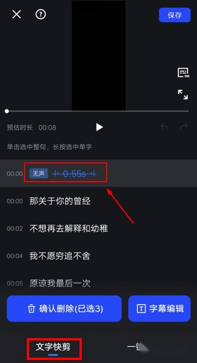 【文字快剪】具备智能识别视频内容的功能,能精准定位语气词、无声片段以及重复片段;只需选中这些内容,就能一键完成删除操作,帮助用户快速提升剪辑效率!