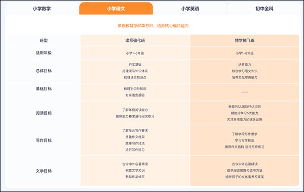 猿辅导先依据孩子的不同特点做了分类,划分出读写强化班和博学腾飞班两个班级,这两个班级面向的都是小学一年级到六年级的学生。读写强化班主要以夯实基础为目标,助力小朋友构建读写知识框架、梳理语文知识点;博学腾飞班则侧重于培养能力,帮助小朋友提升语文知识综合运用能力,同时培养他们的文化审美素养。由此可见,这两个班级的教学目标存在一定差异。