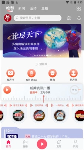 在首页可以看到四个板块,分别是推荐、新闻、活动和直播。